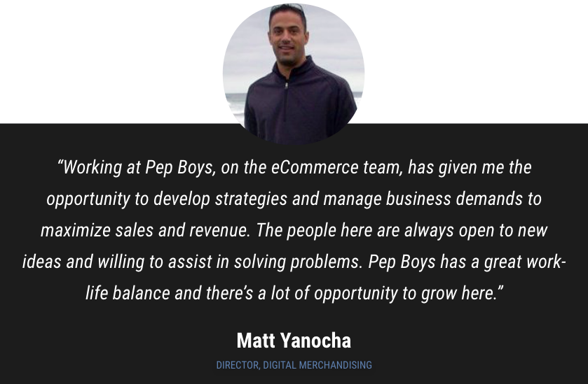 “I always knew I wanted to work in the automotive repair industry. Before I worked at Pep Boys, I bounced around from shop to shop until I found myself with the competition across the street. I would always notice how clean and bright the Pep Boys shop was. Also, it was always busy and the associates seemed happy. I decided to apply at Pep Boys for a part-time installer position not knowing what the future had in store for me. That was almost 15 years ago. Because of the great people and excellent training, I’ve been able to achieve a master technician position and secure my future. I recommend that anyone who wants to work in the auto repair industry should give Pep Boys a try.”